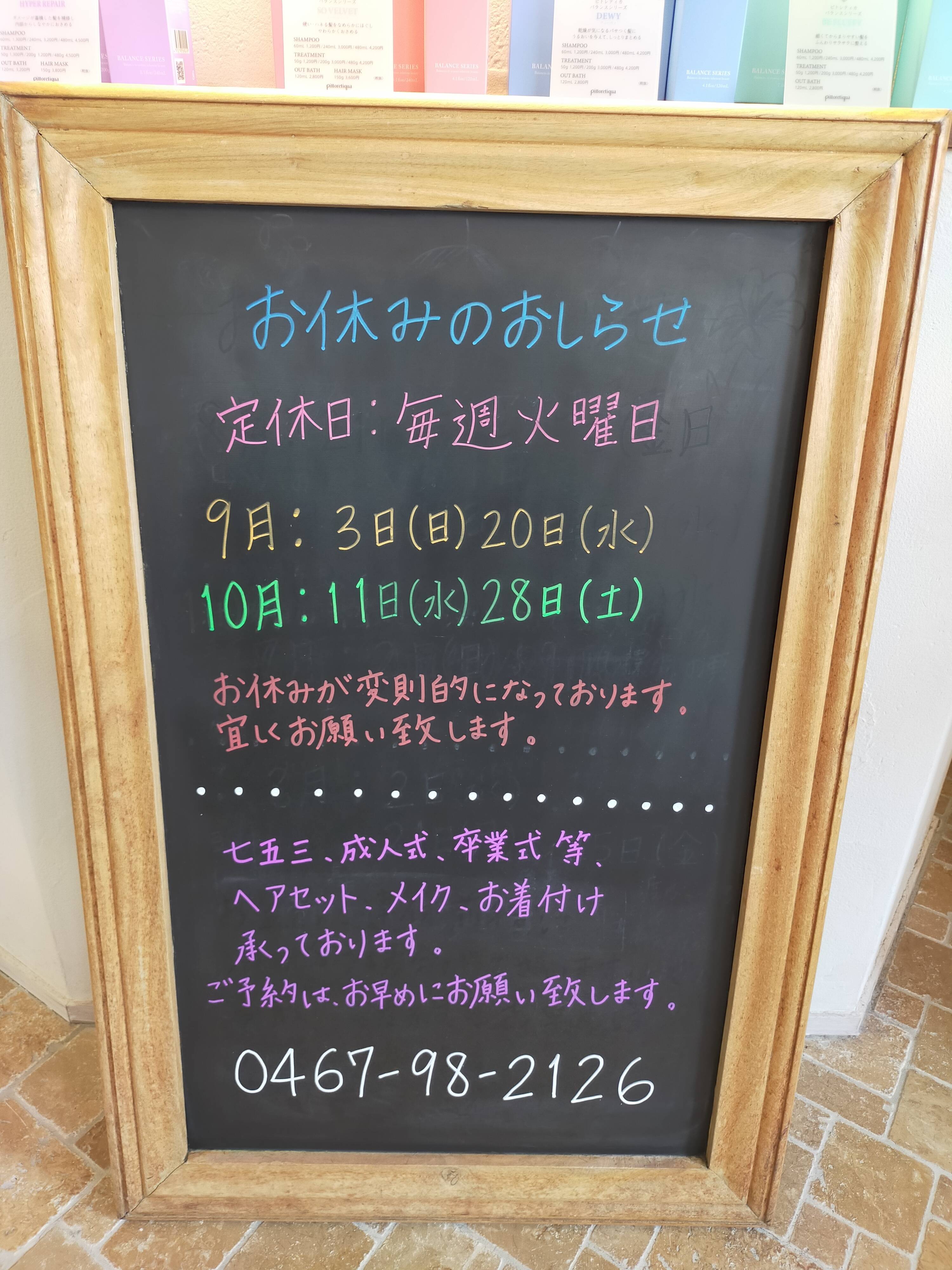 9月のお休みは、毎週火曜日と